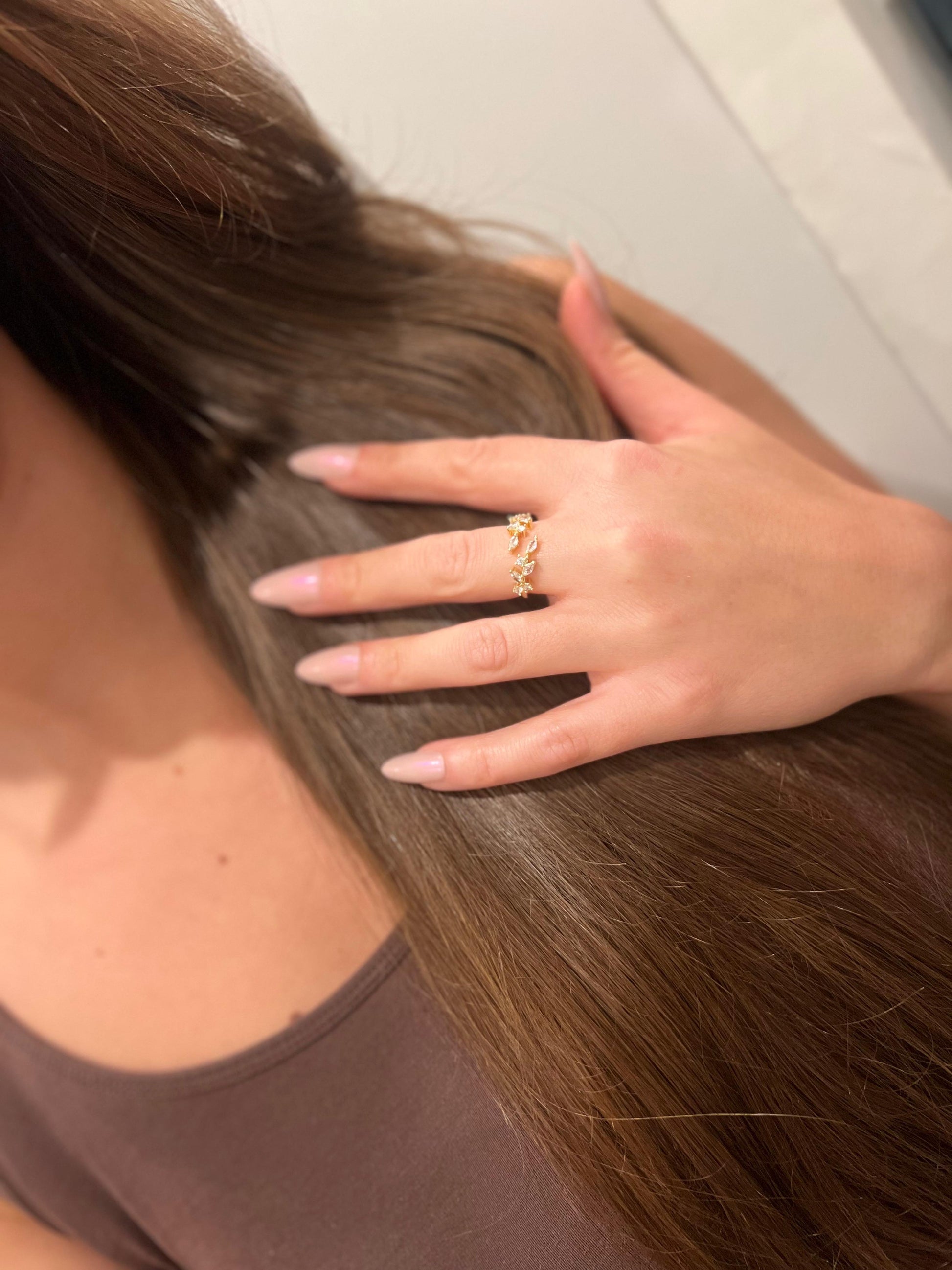 Omarm de elegantie van de natuur met deze betoverende bladring! Het verfijnde design, uitgevoerd in koper met een sprankelend zirkonia mozaïek, combineert organische schoonheid met een vleugje sexy uitstraling. Of u nu een feestelijke bijeenkomst bijwoont of een zonnige vakantie viert, deze ring is uw perfecte accessoire.