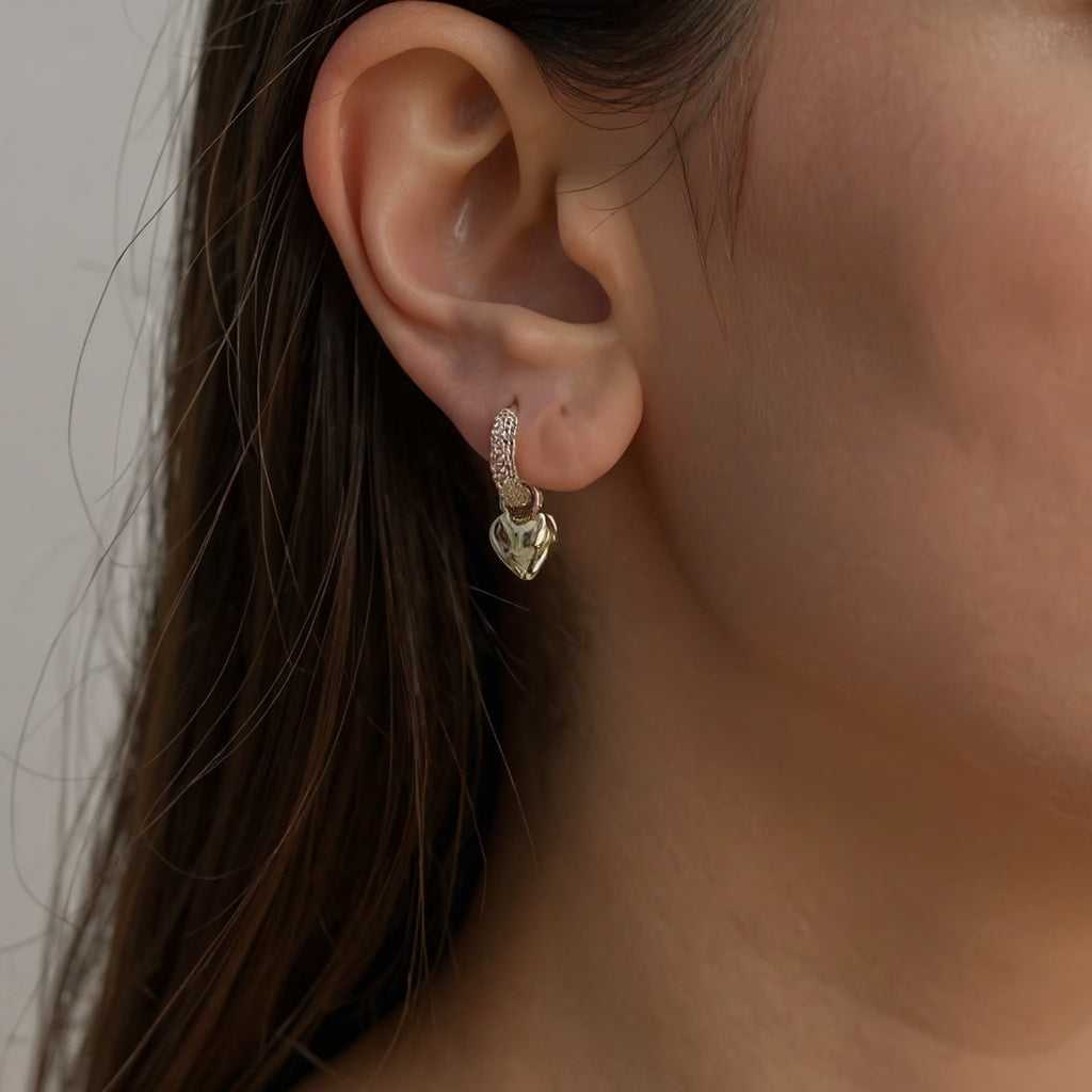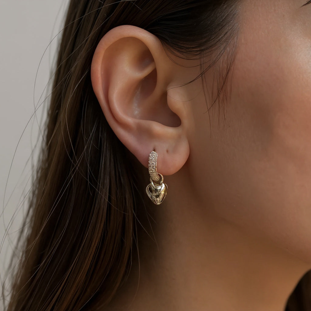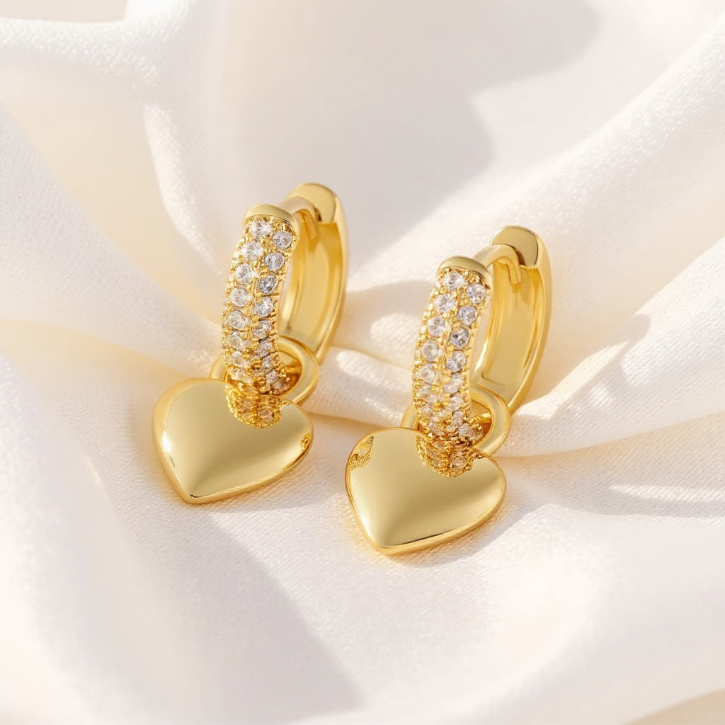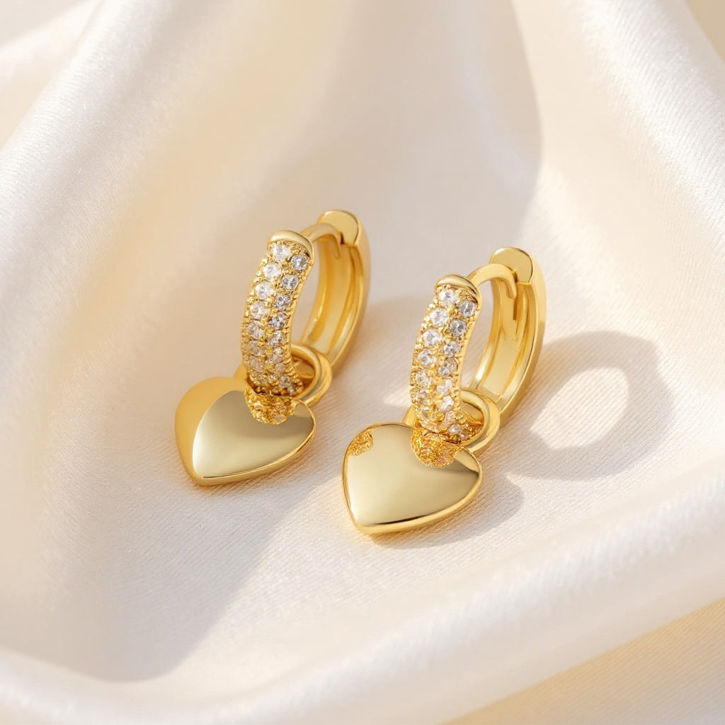 Laat uw hart spreken met deze betoverende hartvormige hangende oorbellen! Het verfijnde design combineert romantische elegantie met de schittering van kubische zirkonia steentjes. Of u nu een casual outfit wilt opwaarderen of een speciaal moment wilt vieren, deze oorbellen stralen tijdloze klasse uit.