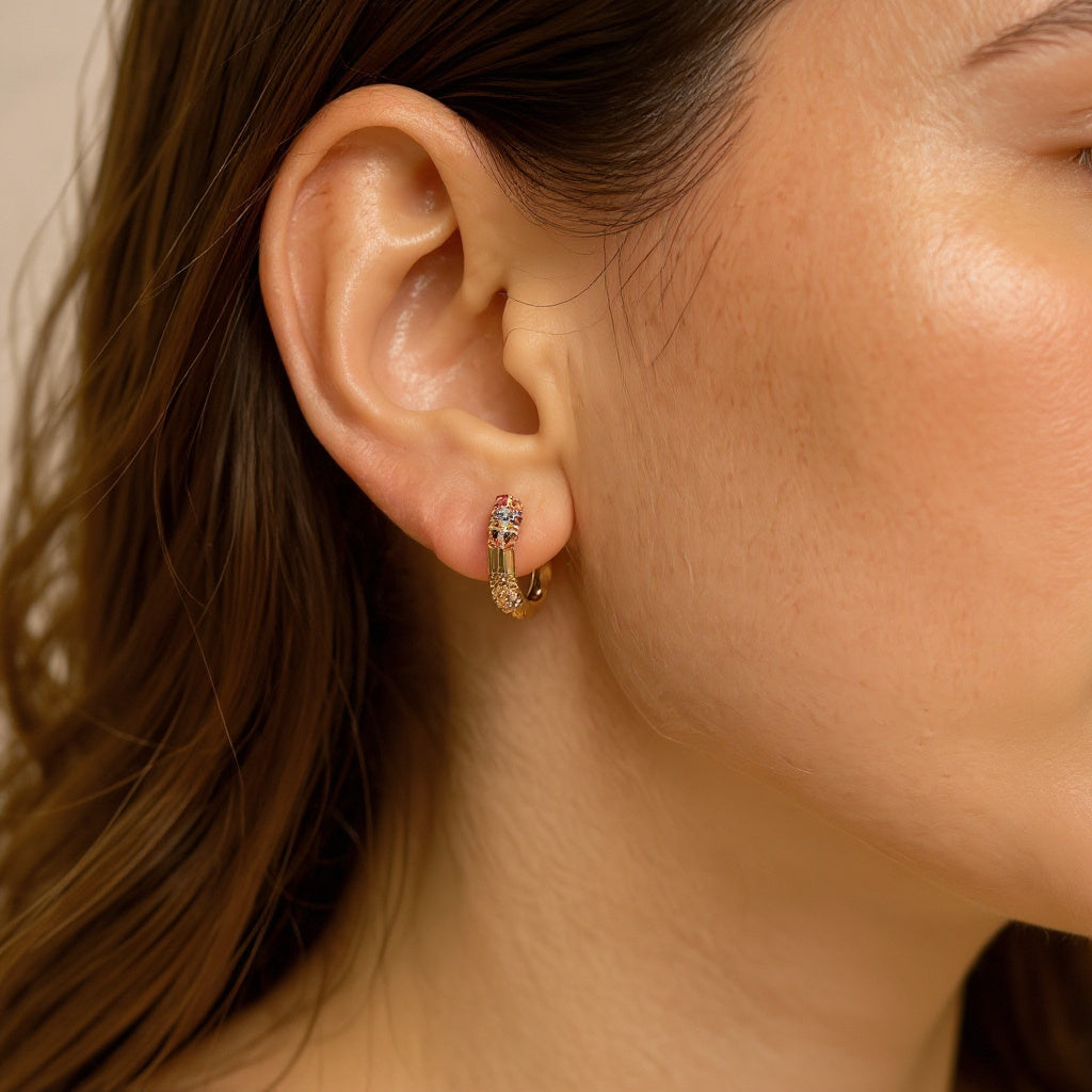 Stralend zoals de Eiffeltoren bij nacht! Deze adembenemende oorbellen combineren verfijnde Franse elegantie met een speelse twist van multicolor zirkoonsteentjes. Elke beweging zorgt voor een betoverend kleurenspel dat niet onopgemerkt blijft.
